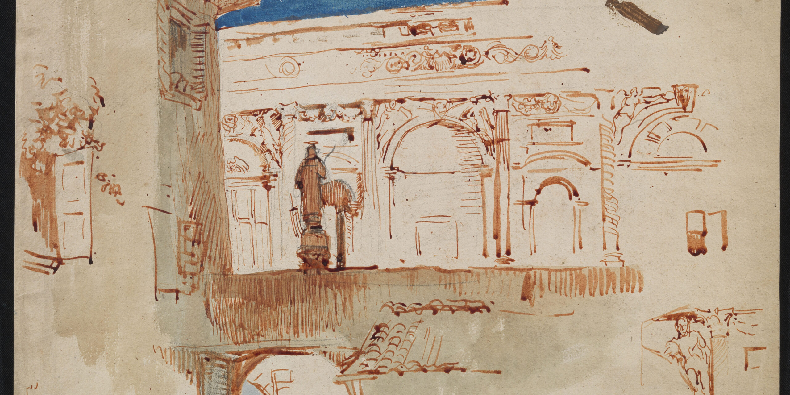 Red ink pen, blu ink water-color on brownish paper, 273 x 405 mm