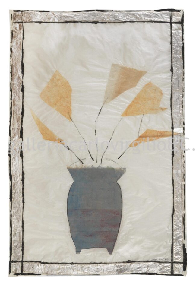Isabella Ducrot Naples 1931 Blue Vase and Orange Flower • 2023 Pigments, collage and silver leaf on Japan paper, 96 x 64 cm Signed lower right “Isabella Ducrot 2023”