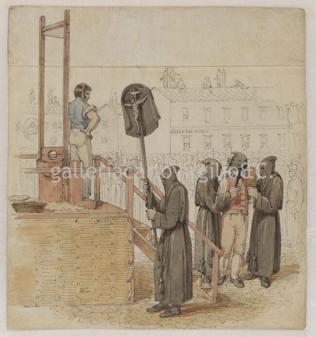 Richard Hicks Bridgens Birmingham 1785 – Port of Spain, Trinidad 1846 An execution in Rome for murder, Mastro Titta awaits the condemned on the gallows • 1820 Penna e acquerelli su carta, mm 215 x 200 Disegno preparatorio per l’incisione all’acquatinta pubblicata a Londra nel 1820